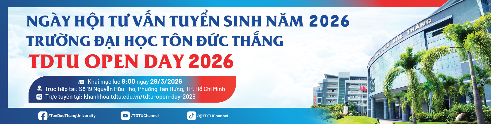 Chào mừng quý phụ huynh và các bạn học sinh đến với không gian trải nghiệm trực tuyến của Trường Đại học Tôn Đức Thắng - Phân hiệu tại Khánh Hòa trong khuôn khổ Ngày hội Tư vấn tuyển sinh TDTU Open Day 2026.